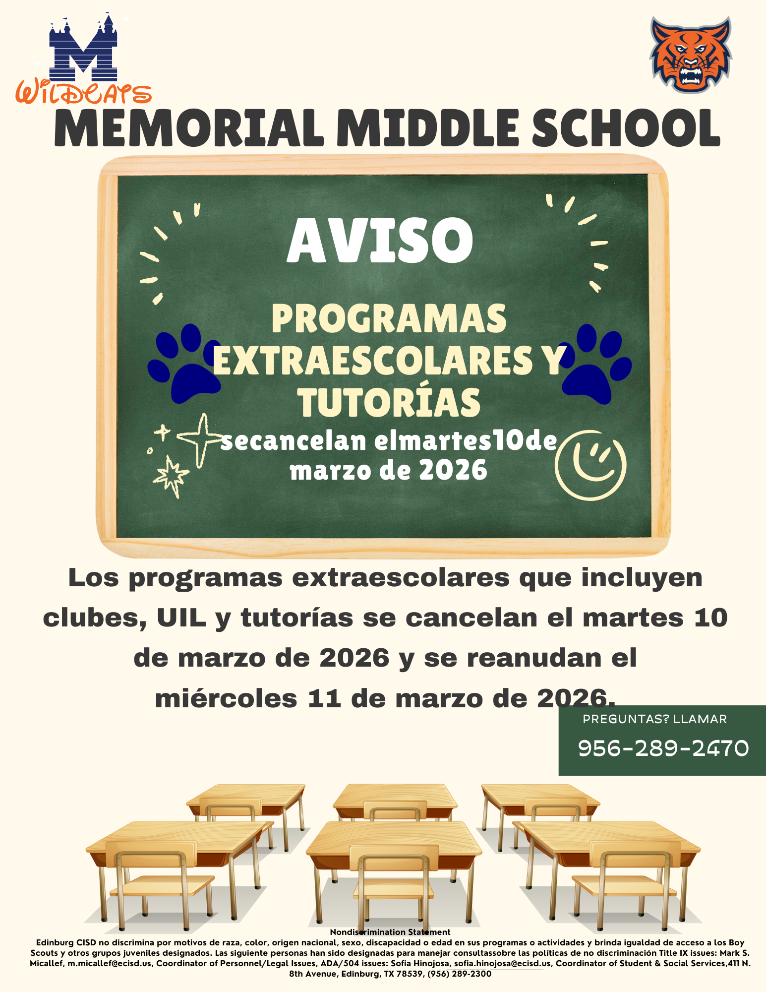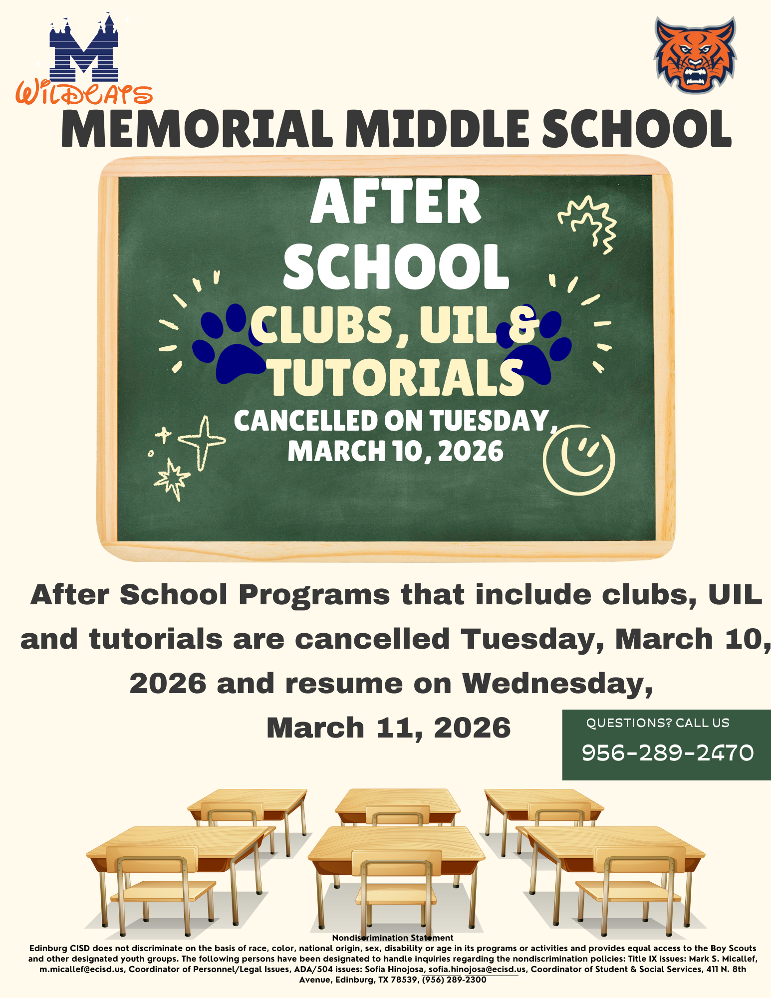 After School Clubs, UIL and Tutorials Cancelled Tues. March 10, 2026